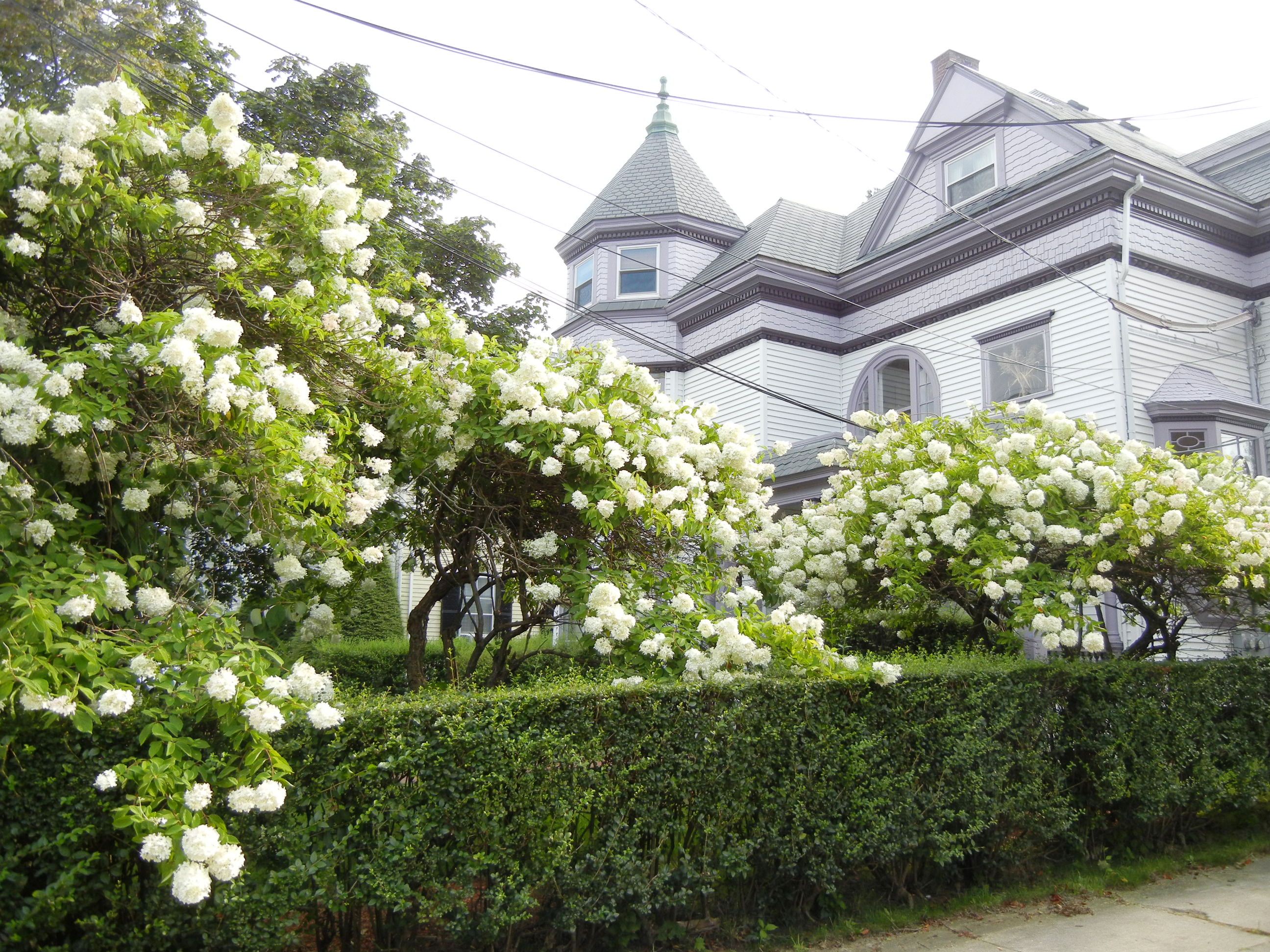 Impressive, but still blue. Back in Massachusetts, I tried to capture some white hydrangea shrubs/trees that impressed me, many of them apparently quite old. I do like hydrangeas that spill over fences, like the first two photographs below, the first taken in Newburyport, the second in Salem.